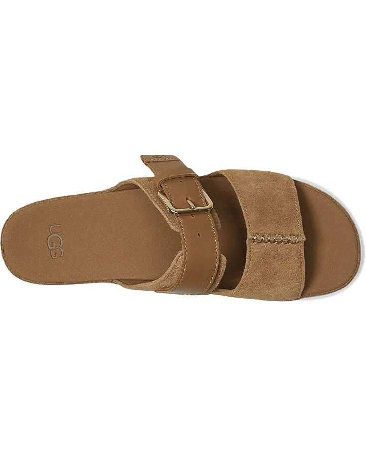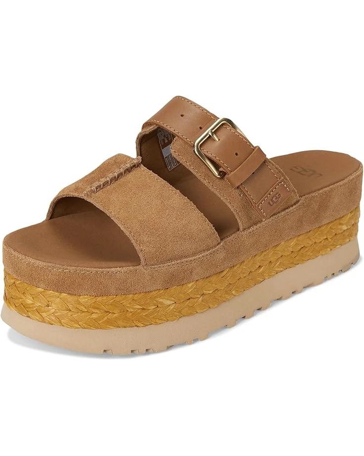 - Step up in style-where coastal charm meets effortless comfort! The UGG® Aubrey Slide is all dressed up with everywhere to go, featuring a chic mix of suede, leather, and raffia for a breezy, beach-meets-city vibe. Designed with a chunky yet feather-light platform, this slide offers an elevated look without the extra weight. The soft microfiber lining ensures breathable comfort, while the sugarcane-derived EVA outsole keeps each step cushioned and sustainable. A hidden elastic panel flexes with you for all-day ease, and the adjustable buckle strap lets you customize the fit. Slip into effortless luxury with the Aubrey Slide!
