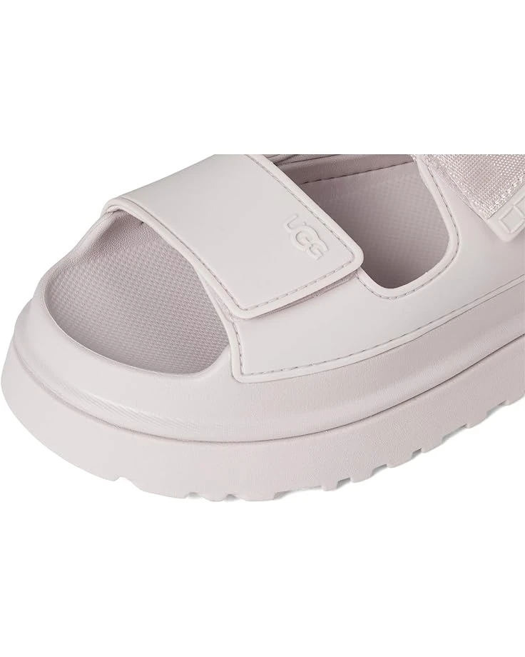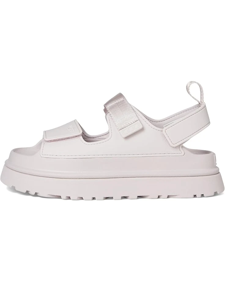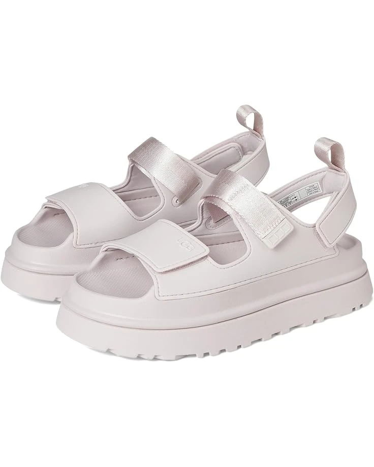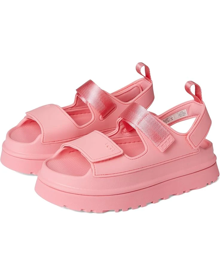 - Bring comfort to your feet by wearing the UGG® Goldenglow sandals. The slip-on style sandals are super lightweight and ultra-comfortable. They have hook-and-loop closures for a custom fit, quarter strap webbing made from recycled polyester, an open round-toe design, stretchy back strap with an ankle pull tab for easy wearing. The sandals have TPU upper, textile lining made from recycled polyester fibers, and sugarcane EVA footbed and midsole for added comfort.