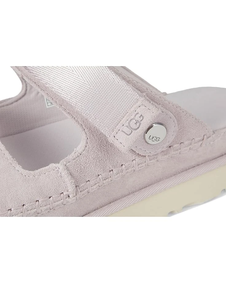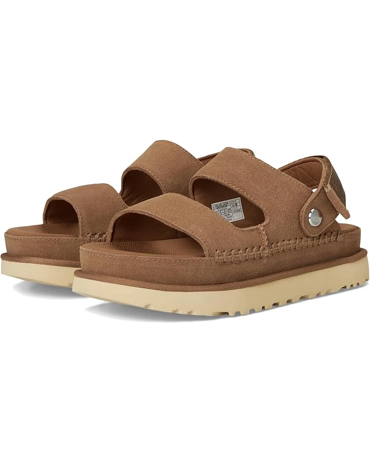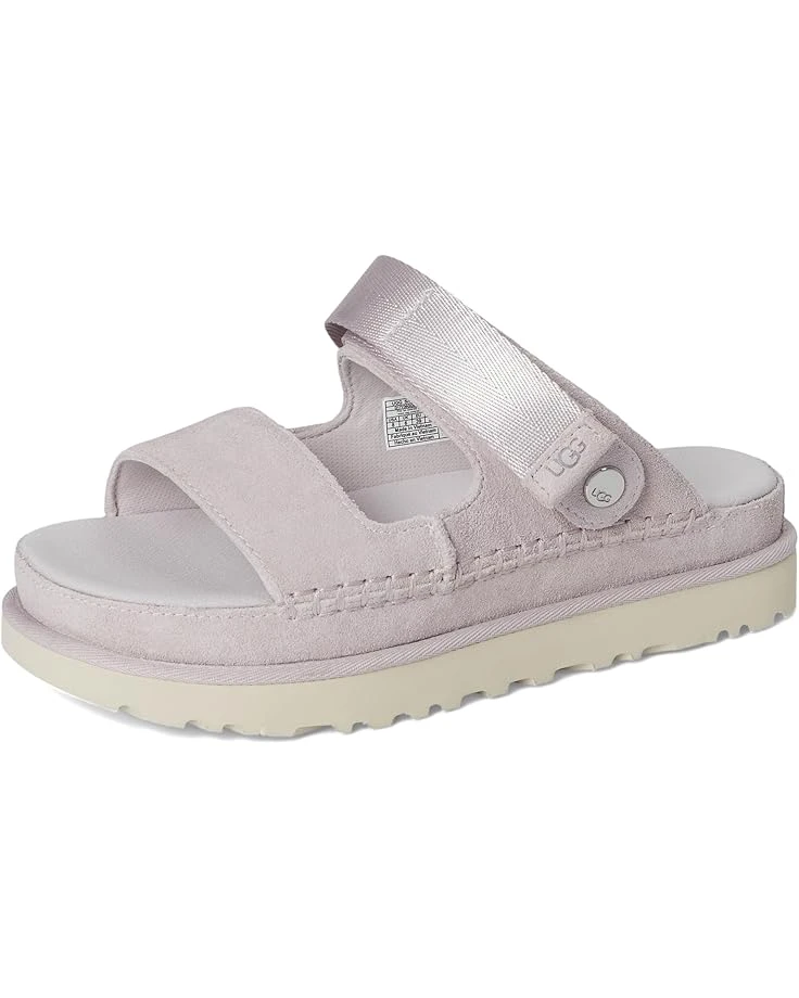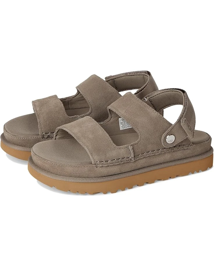 - Ready, set, glide. The UGG® Goldenstar Glide brings convertible comfort to all of your sunny-day excursions. It’s designed with an adjustable heel strap that can flip to the front for slide-like access when you’re on the go. The contoured footbed is lined with soft, recycled material infused with an anti-odor treatment to keep you feeling fresh. It comes with webbing heel strap, hook-and-loop closure, contoured EVA footbed, Sugarcane EVA® midsole made with recycled EVA regrind.