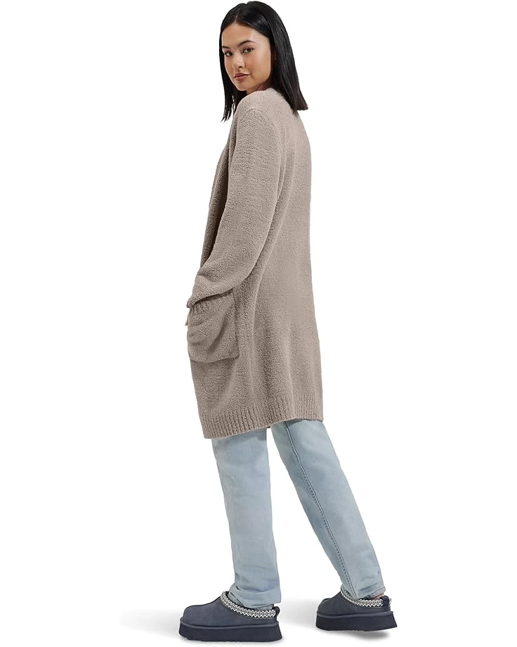 - Layer up the UGG® Kallie Cardigan this winter season and experience the cosiest feel while flaunting an ultra-modern style. The knit cardigan is beautifully designed with a on open-front style, two patch pockets on the front, and ribbed knit cuffs & hem. It is intended to hit at the knees.