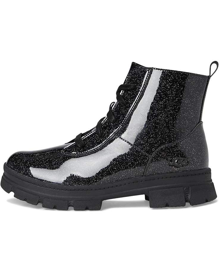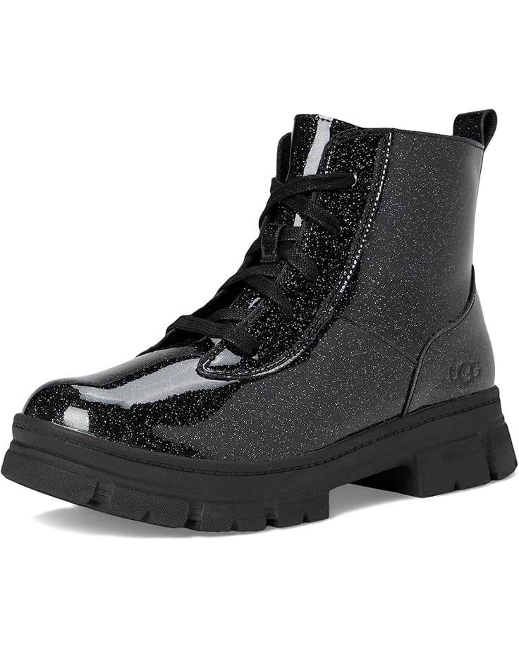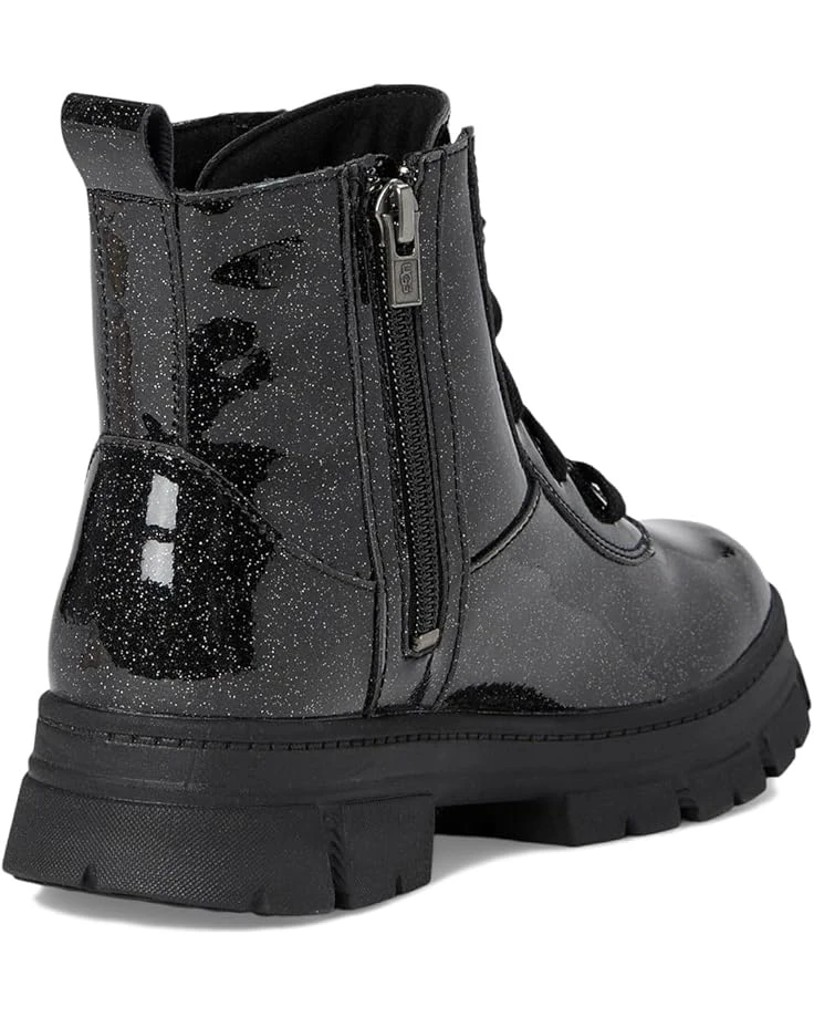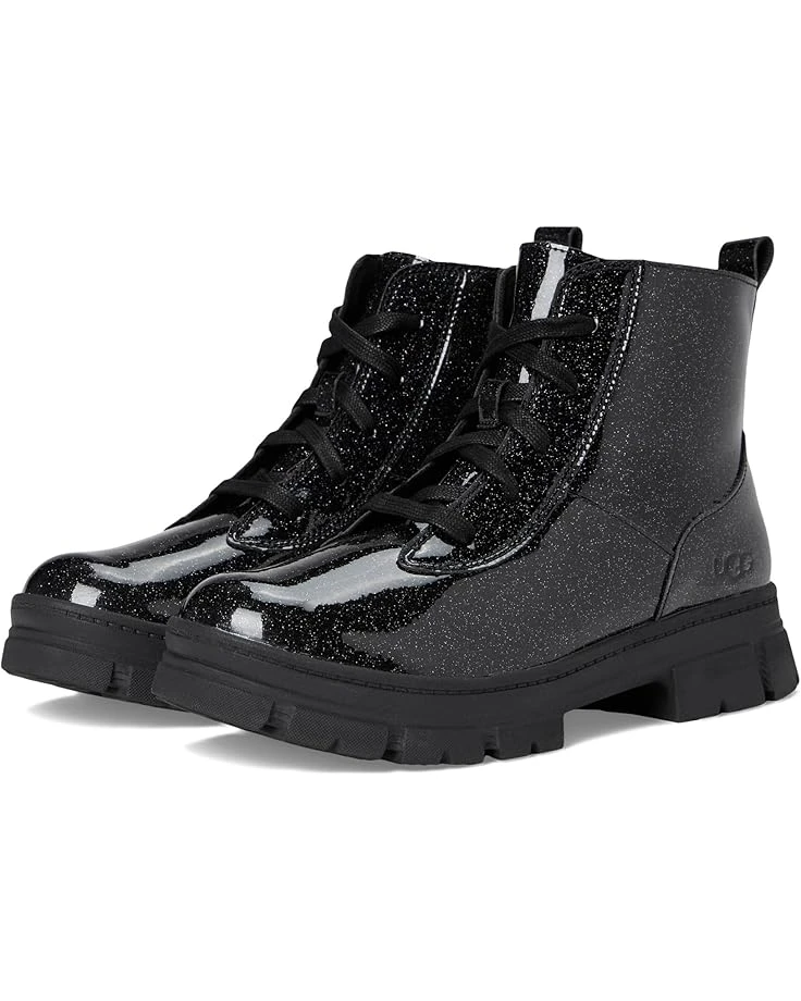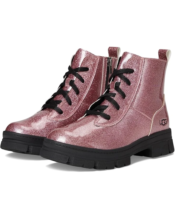 - Coated with a glittery finish, the UGG® Kids Ashton Lace-Up Glitter Lace-Up Boots define an eye-catching chic look. Along with the stretch laces, these booties also consist of an alternative zippered side closure for a snug fit.