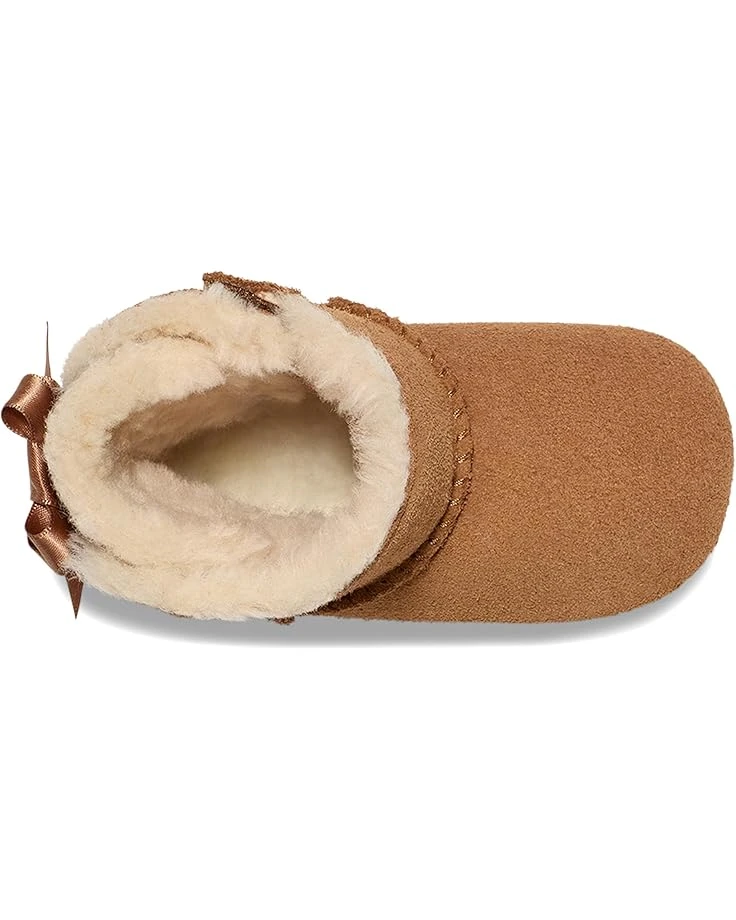 - Step into cuteness: UGG® Kids Baby Bailey Bow! Adorned with an adorable fixed bow, these cozy boots feature a secure hook-and-loop closure for easy on and off. The molded rubber outsole ensures safe, stable steps, while the suede upper and plush wool lining keep tiny feet warm and stylish.