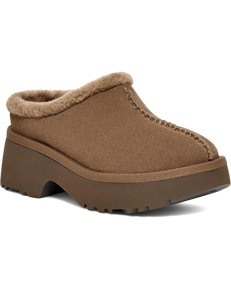 - Stay cozy with the cheerful delight and fashioned charm of UGG® New Heights Cozy Clog. The slip-on footwear features suede upper construction with twin-seam detailing and stacked heels for added height.